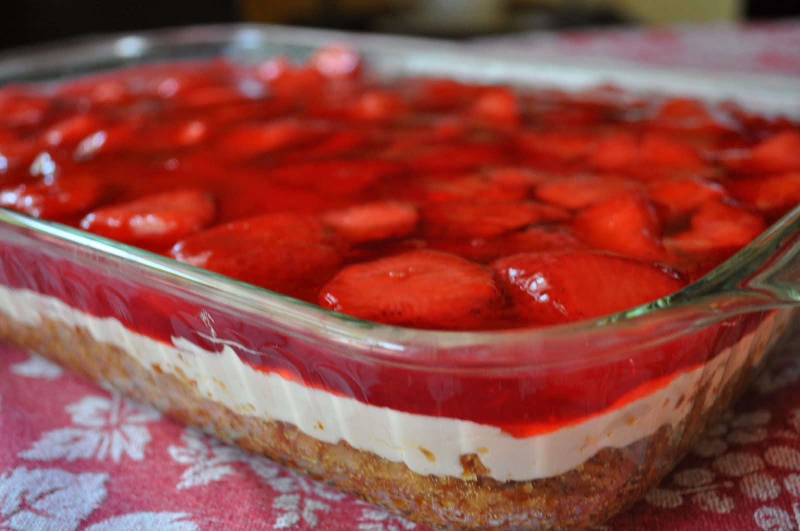 Jello layer: In a bowl, slowly whisk boiling water into jello powder. Stir in strawberries. Refrigerate. When the jello has cooled and just started to set, pour over cream cheese, spreading out the berries so that they are evenly distributed. Please, please, DO NOT pour the jello layer on until it is cool and has started to congeal, or the heat will float up the layers, and the jello will leach into the pretzels, and make them soggy (gross).