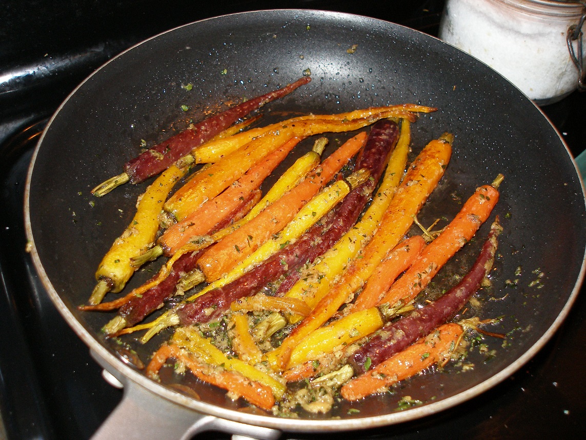 Here’s the deal about bagged baby carrots. You may remember my warnings against those chemical-laden faux-baby abominations. Really, just leave them in the grocery store. Except for this one exception: organic, rainbow, pre-packaged babies. I picked up a bag at the co-op in Durham; they were the real thing, and cooked up well.