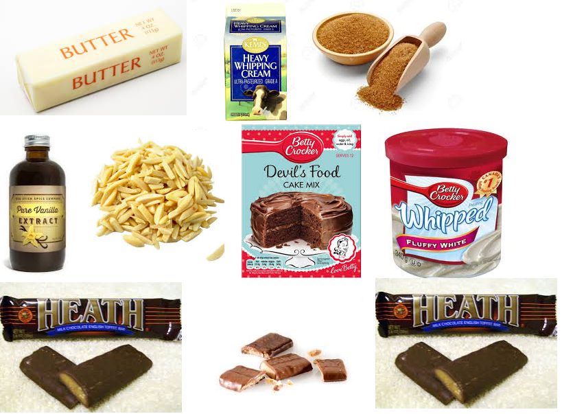 Frosting: Empty cans into bowl and mix in 4 of the chopped candy bars. Frost top of first cake nut side up, place on second layer, nut side up, and thickly frost it. Scatter pieces of the 5th candy bar and final ¼ cup of almonds on top.