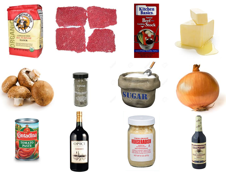 Put in ‘shrooms and onions, and cook until lightly caramelized. Add tomato paste and cook for 2-3 minutes. Deglaze with sherry and allow to cook out. Add rest of ingredients, except roux and steak. Bring to boil, and whisk in enough roux to make a light gravy.