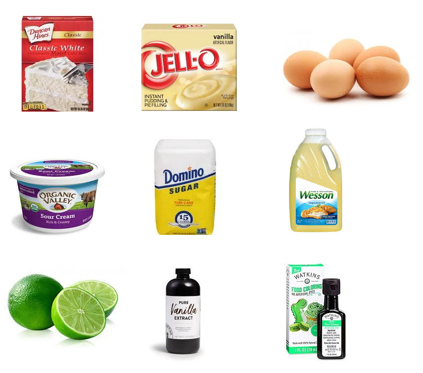 In a large mixing bowl, combine cake mix, pudding, eggs, sour cream, sugar, oil, key lime juice and vanilla. Beat for three minutes. Add green food color if you desire.