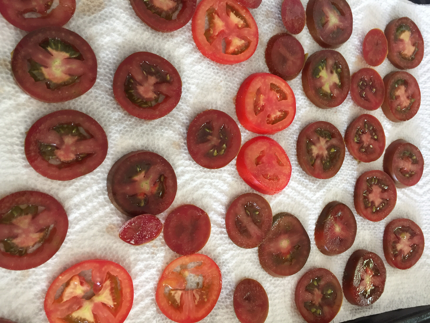 At the farmers market, we chose beautiful, ripe, and juicy summer heirloom tomatoes.  Unfortunately, when cooking, that juice was too juicy, and initially resulted in a wet finished product.