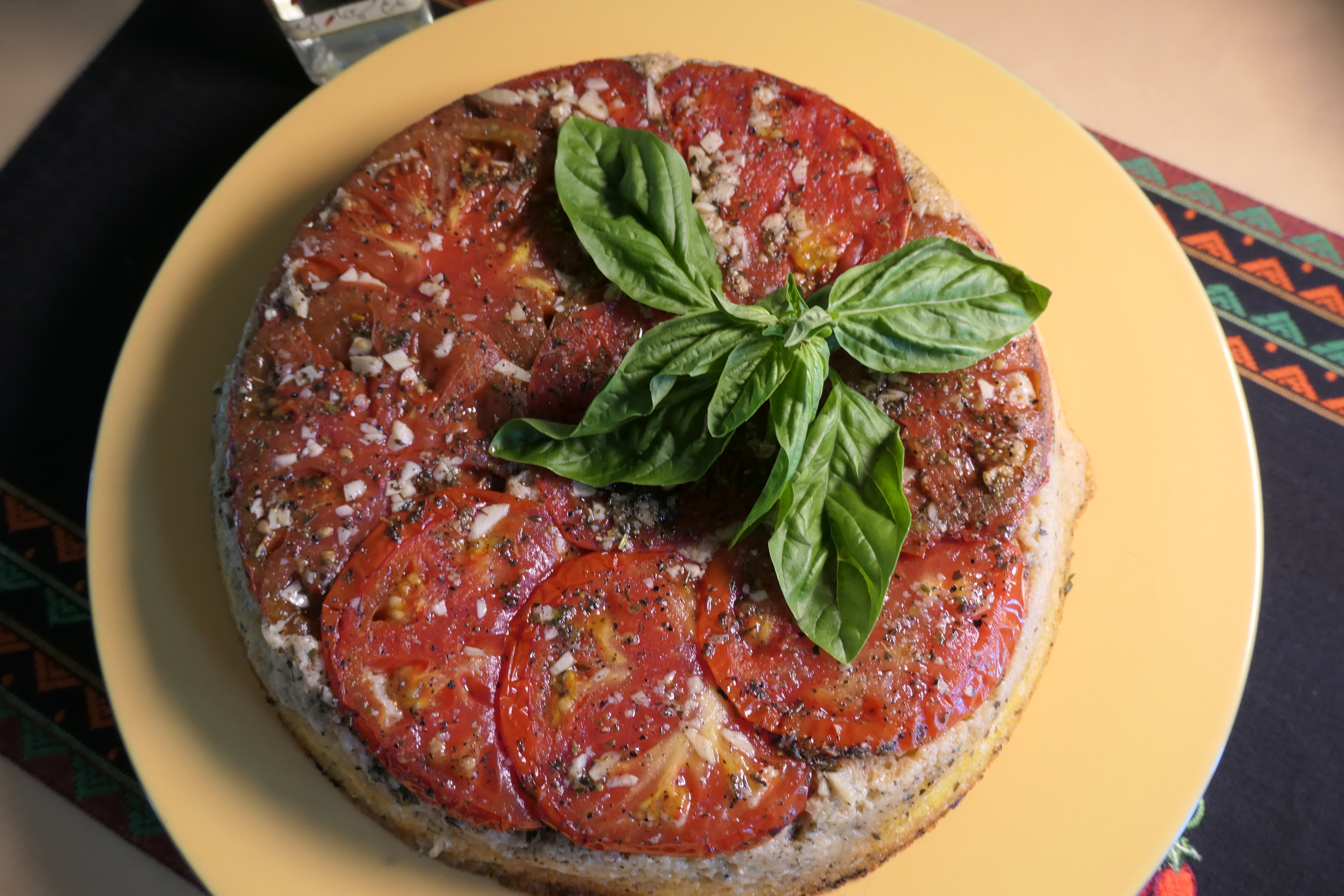 Take the skillet out of the oven and spread the batter carefully over the tomatoes. Bake at 425° for 12 – 14 minutes or until a wooden pick inserted in center comes out clean. Rest in pan for 5 minutes then invert onto a serving platter. Sprinkle fresh basil over the top and serve.