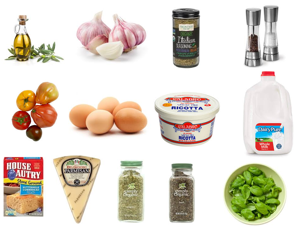 In the meantime, in a large bowl, whisk together the eggs, ricotta cheese, and milk, then stir in cornbread mix, Parmesan, dried oregano and dried basil until just combined.