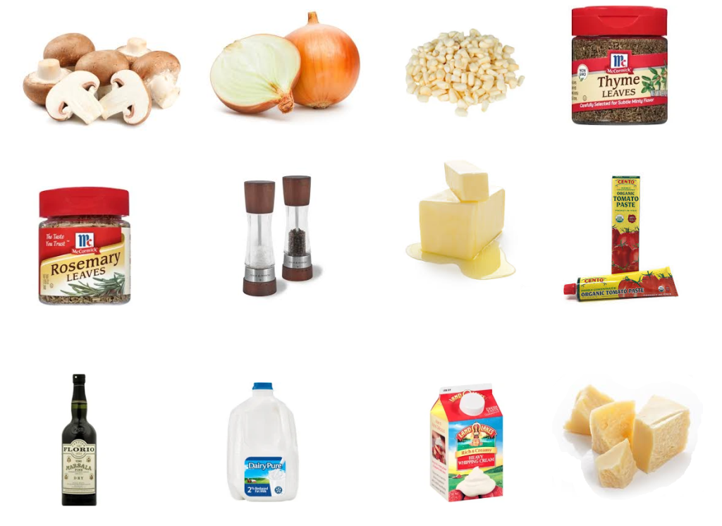 Sautee vegetables in the butter with thyme and rosemary. When the veg are lightly browned, stir in tomato paste. When paste has darkened, deglaze with Marsala. When the wine’s cooked in, add cheese and dairy. Bring to low boil and allow to reduce to sauce-like consistency. Season to taste. Turn to medium-low.