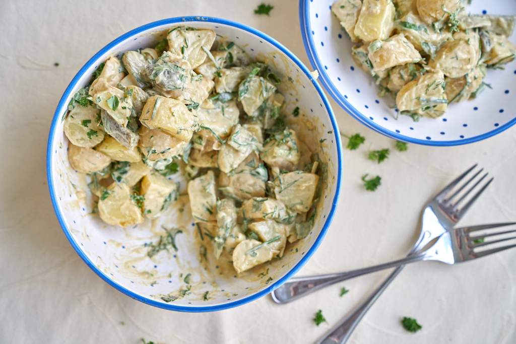 In a pot of very salty water, boil whole, unpeeled potatoes until fork-tender. When they are still hot, but cool enough to touch, peel and cut into salad-sized chunks.