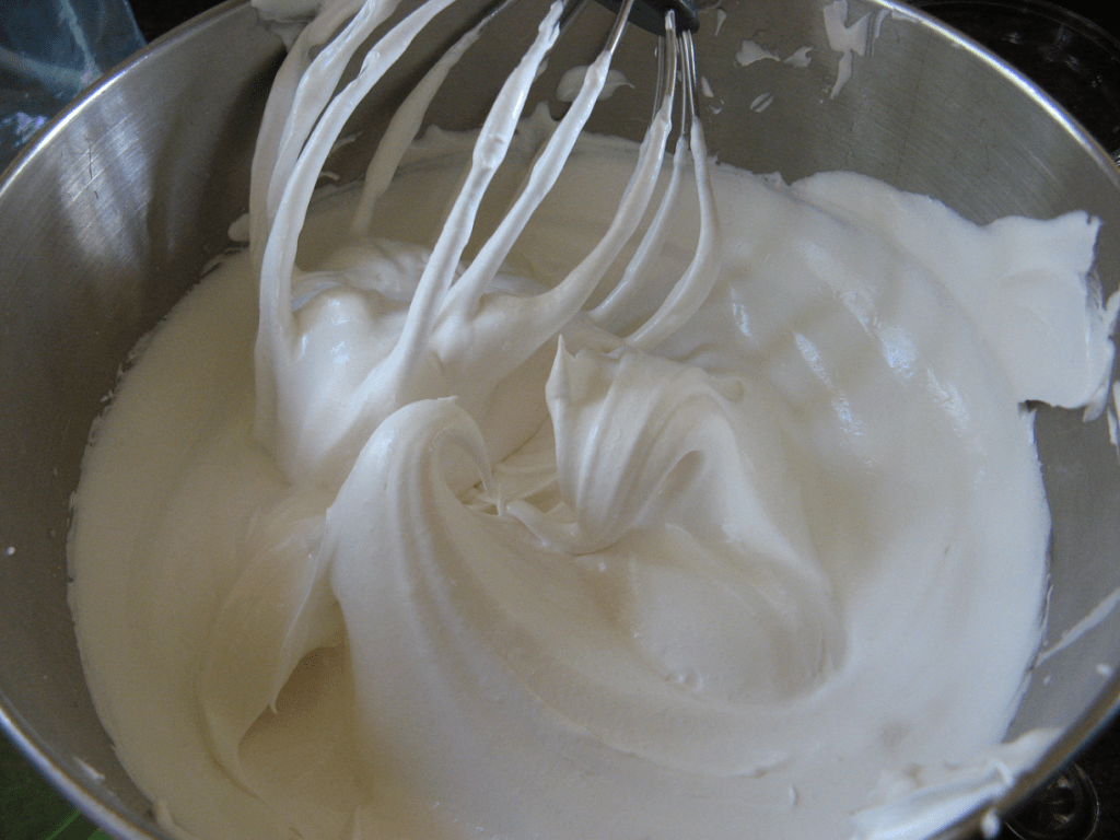 When they turn white, slowly add the sugar a tablespoon at a time. Turn off mixer and scrape down the sides of the bowl.