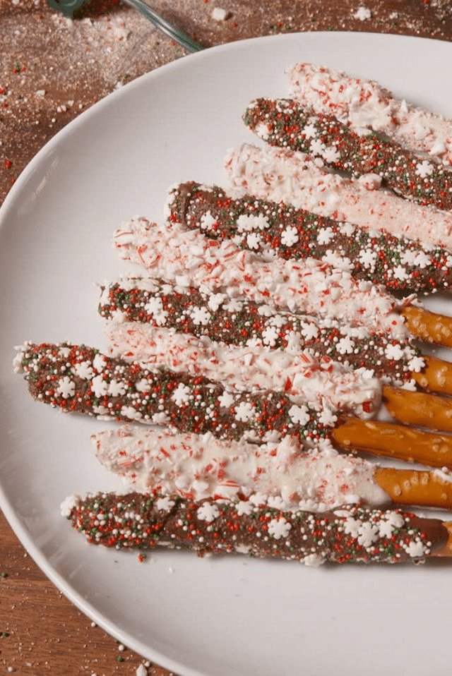 This year we’re also making gussied up pretzels. We’re dunking about 2/3 of a pretzel rod into melted chocolate and decorating. We’re doing two versions; dark chocolate drizzled with white chocolate and sprinkled with candy cane pieces and green and red sprinkles. The other one is dipped into milk chocolate, drizzled with dark, then sprinkled with crushed salted caramel hard candies and sprinkled with gold and silver dragees (balls).