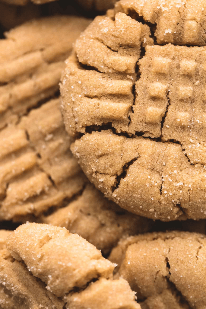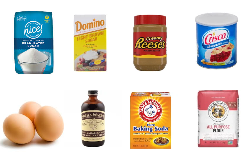 Preheat oven to 350°.  Cream sugars and shortening.  Add eggs, peanut butter, vanilla, flour, and baking soda.