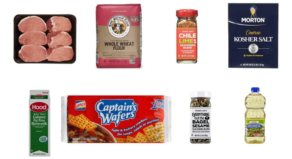 One at a time, coat meat in flour, then buttermilk, then crumbs. As you finish, set in oiled pan. Drizzle coated chops with remaining oil.