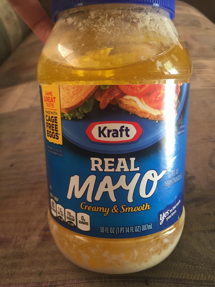 She had jar, after jar, after jar, after jar of mayonnaise. The front jar was recently purchased and good to use. But as the jars got older and older, they got decidedly more toxic looking. The stuff in the very back looked almost radioactive.