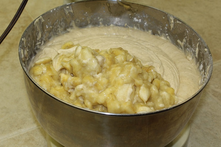 Mix butter and sugar until it’s lighter in color and fluffy. Add vanilla, then eggs one at a time and beat until they’re completely mixed in. Add bananas and water, beat 30 seconds more.