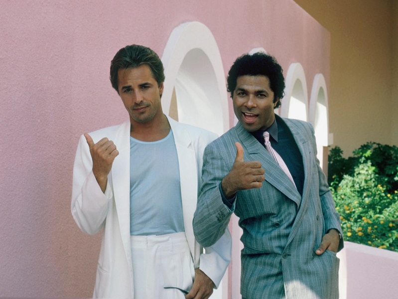 The other style was inspired by revelatory ratings juggernaught, Miami Vice.  Very unstructured, Caribbean-hued jackets and pleated trousers.  Underneath jacket were either collared shirts with twig thin ties, or t-shirts.