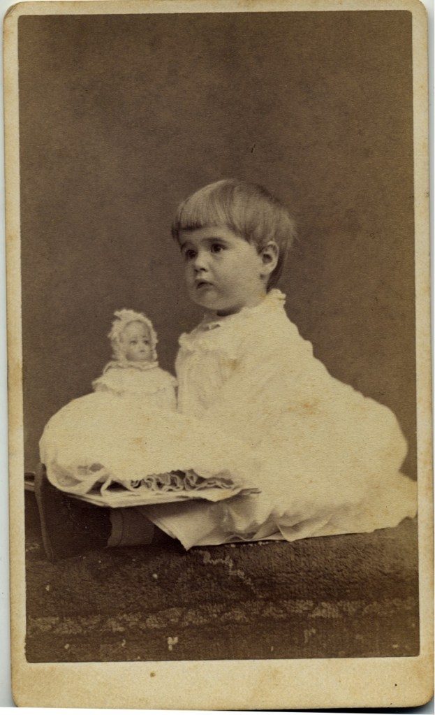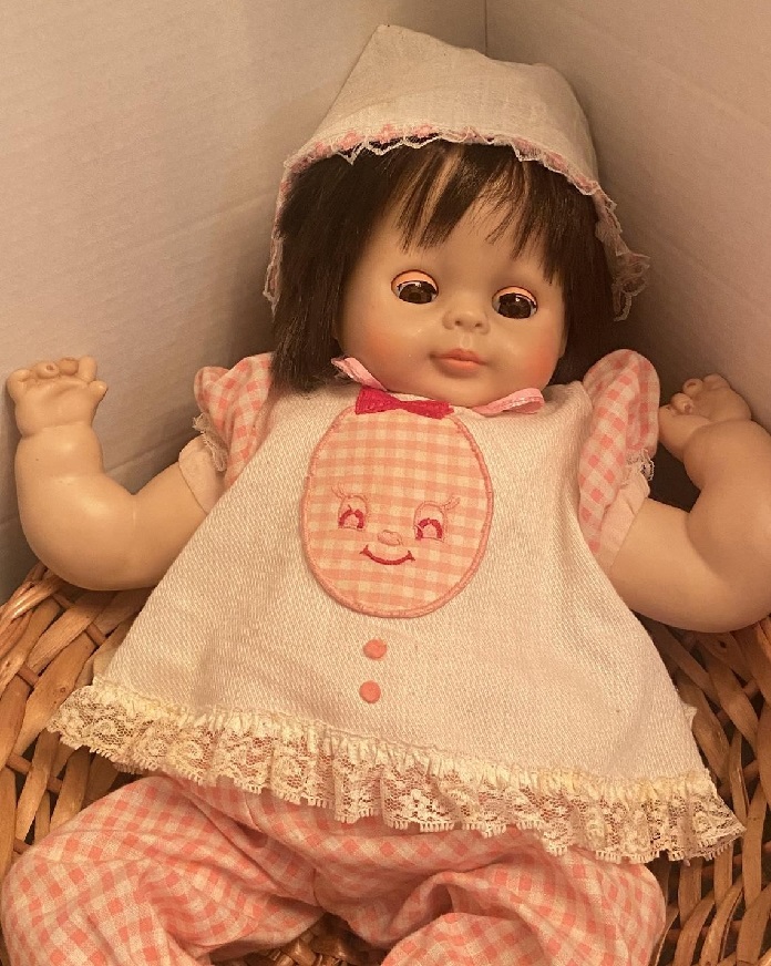My bro had been wailing away, non-stop, ever since he fell.  When I came over to him, holding my fancy new doll, he suddenly stopped.  He was fascinated by her, and the only thing that kept him from hysterics was holding her.  I was persuaded to temporarily turn her over to calm him down.