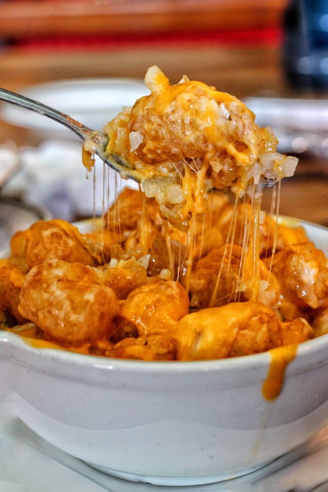 Instead of fries, use tater tots. Cover with lashings of mushroom/onion gravy in which you deglazed with sherry, then added beef stock. Sprinkle on a big handful of coarsely grated hoop cheese on top.