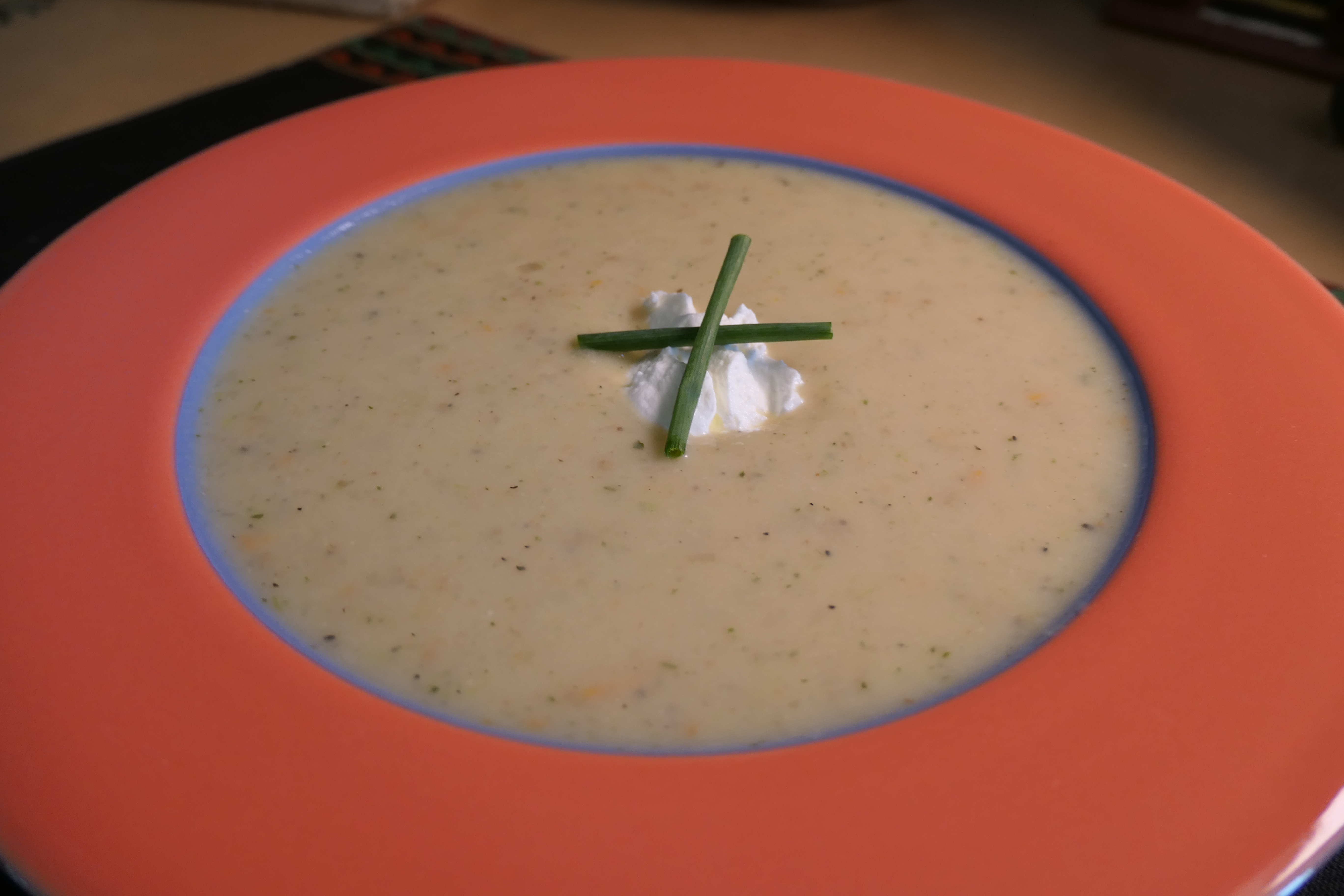 Garnish with chives and small dollop of sour cream.