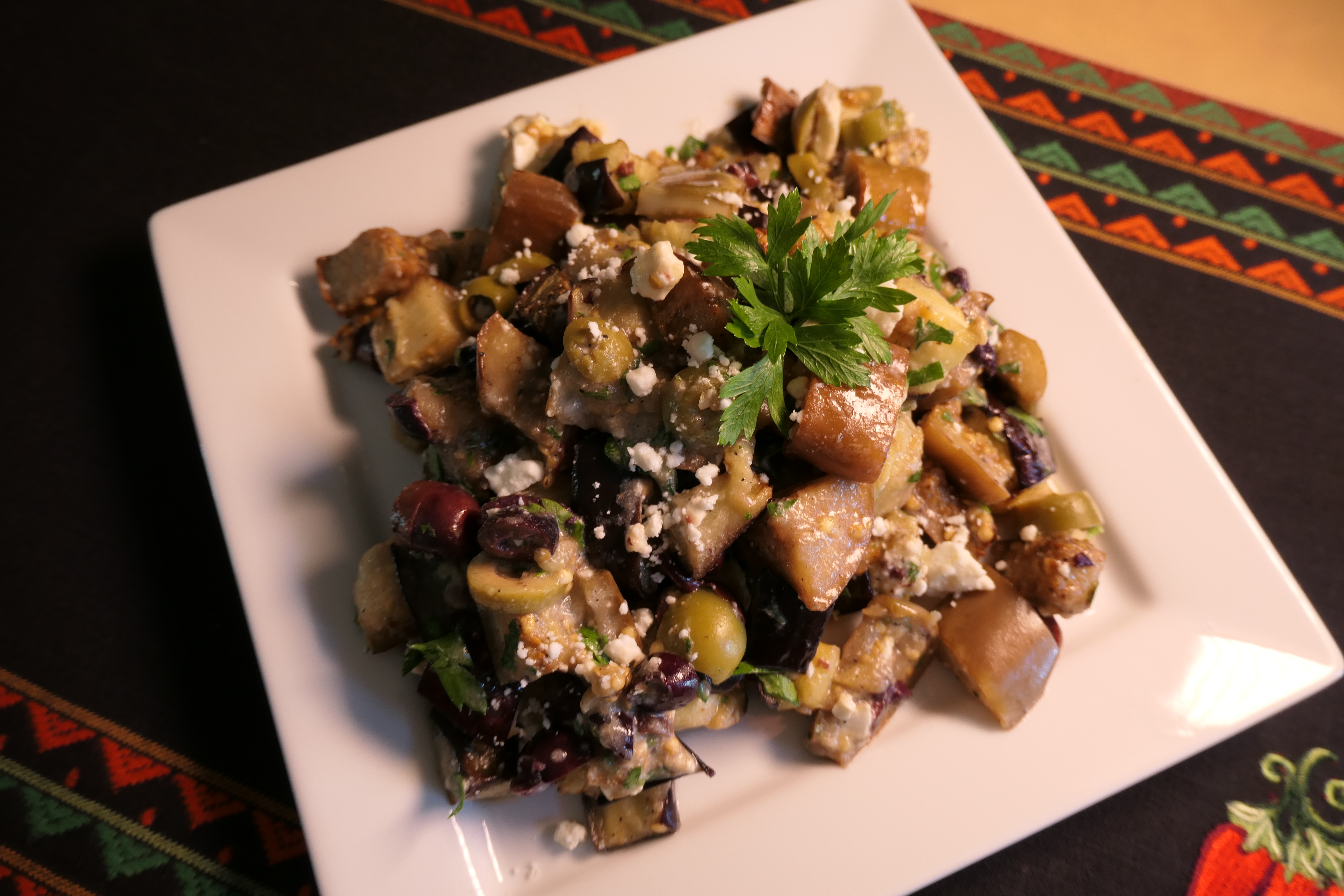 And, finally, the eggplant. This is the easiest to make eggplant recipe I’ve had the pleasure to eat. It’s also the most forgiving. It’s cut into cubes and roasted, so it doesn’t need to be perfect, blemish-free, straight from the garden eggplant. You could make this in the middle of February and the dish would be just as tasty as mid-August.